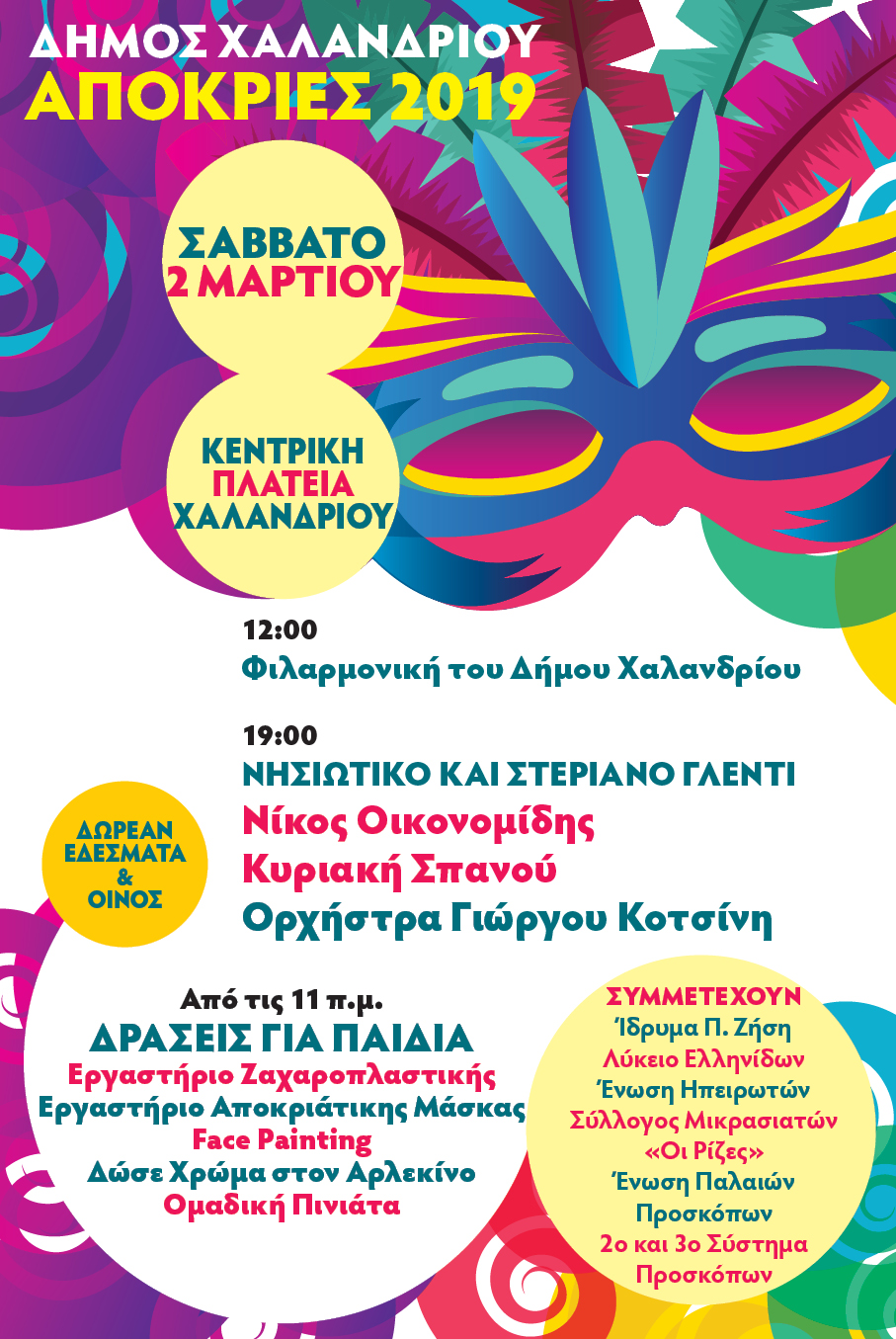 Με παιδικά διαδραστικά εργαστήρια δρώμενα και λαϊκό γλέντι ο δήμος Χαλανδρίου υποδέχεται τις απόκριες.