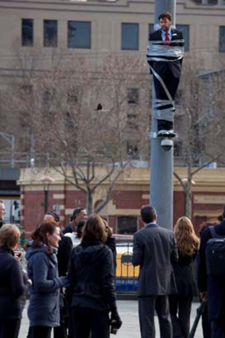 Στην πραγματικότητα η φωτογραφία δεν είναι ούτε από το 2016 ούτε από τη Βραζιλία, αλλά από το 2011 και την Αυστραλία. Πρόκειται για μέρος προωθητικής καμπάνιας της Εθνικής Τράπεζας της Αυστραλίας (NAB), κατά την οποία υποτίθεται ότι άλλες μεγάλες τράπεζες αντεπιτίθενται στην δημοφιλία της πρώτης, απαγάγοντας έναν υπάλληλό της και δένοντάς τον σε έναν στύλο. Η ενέργεια δηλαδή ήταν σκηνοθετημένη και δεν αποτέλεσε δείγμα αγανάκτησης των πολιτών. Διάφορες λήψης του προωθητικού τρικ είχαν γίνει τότε viral στα social media [πηγές 1, 2].