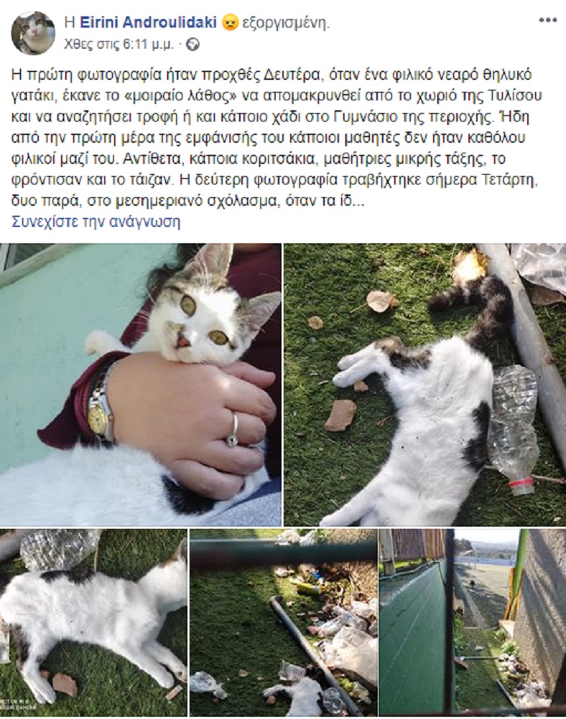 Όπως γράφει η κ. Ειρήνη Ανδρουλιδάκη σε ανάρτησή της στον προσωπικό της λογαριασμό στο Facebook, όλα ξεκίνησαν την περασμένη Δευτέρα, όταν ένα γατάκι βρέθηκε κοντά στο Γυμνάσιο της περιοχής. Από την πρώτη στιγμή, τόσο μια ομάδα μαθητριών, όσο και καθηγητές το τάιζαν και προσπαθούσαν να του βρουν μια οικογένεια. Την ίδια ώρα ωστόσο, όπως αναφέρει, κάποιοι από τους μαθητές ήταν εχθρικοί απέναντί του, κλωτσώντας το.