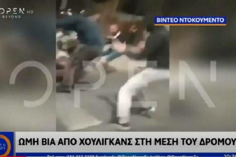 Το βίντεο-ντοκουμέντο δείχνει τη στιγμή που χούλιγκαν χτυπά και ρίχνει κάτω από τη μηχανή έναν νεαρό ενώ λίγα μέτρα πιο πέρα, δέχεται χτυπήματα ο συνεπιβάτης του από άλλη ομάδα ατόμων με γροθιές και αντικείμενα.