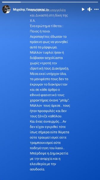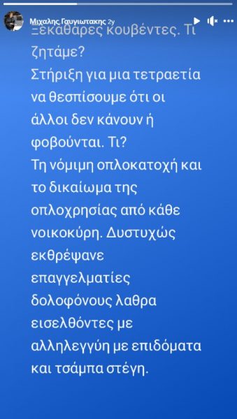 Σε ανάρτησή του μάλιστα δεν φοβάται να μιλήσει ανοιχτά για την νομιμοποίηση της οπλοκατοχής κάνοντας ανοιχτή επίθεση σε μετανάστες αποκαλώντας τους «λαθρό».