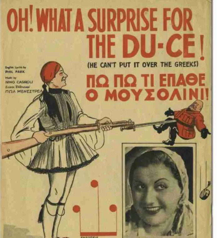 Με το ξεκίνημα του 1941 ανεβαίνει στο θέατρο Μοντιάλ η επιθεώρηση Bella Grecia των Χαρίτου, Λαουτάρη, Παπαδόπουλου. Η Βέμπο τραγουδά δυο νέα πολεμικά τραγούδια: το «Στον πόλεμο βγαίν΄ο Ιταλός» παρωδία του Γ. Θίσβιου πάνω στη μεγάλη επιτυχία της Βέμπο «Στη Λαρσα βγαίν΄ο Αυγερινός» και το «Βάζει ο Ντούτσε τη στολή του».