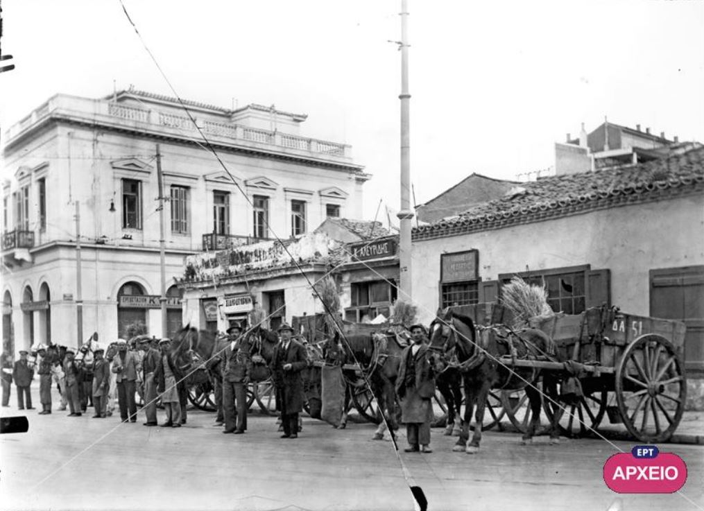 Στη φωτογραφία, η οποία ανήκει στη συλλογή «Πέτρου Πουλίδη» και τραβήχτηκε το 1924, φαίνεται η πλατεία Αγίων Ασωμάτων, κοντά στο Θησείο, και οι εικονιζόμενοι είναι υπάλληλοι της καθαριότητας του δήμου που στέκονται δίπλα στα κάρα.