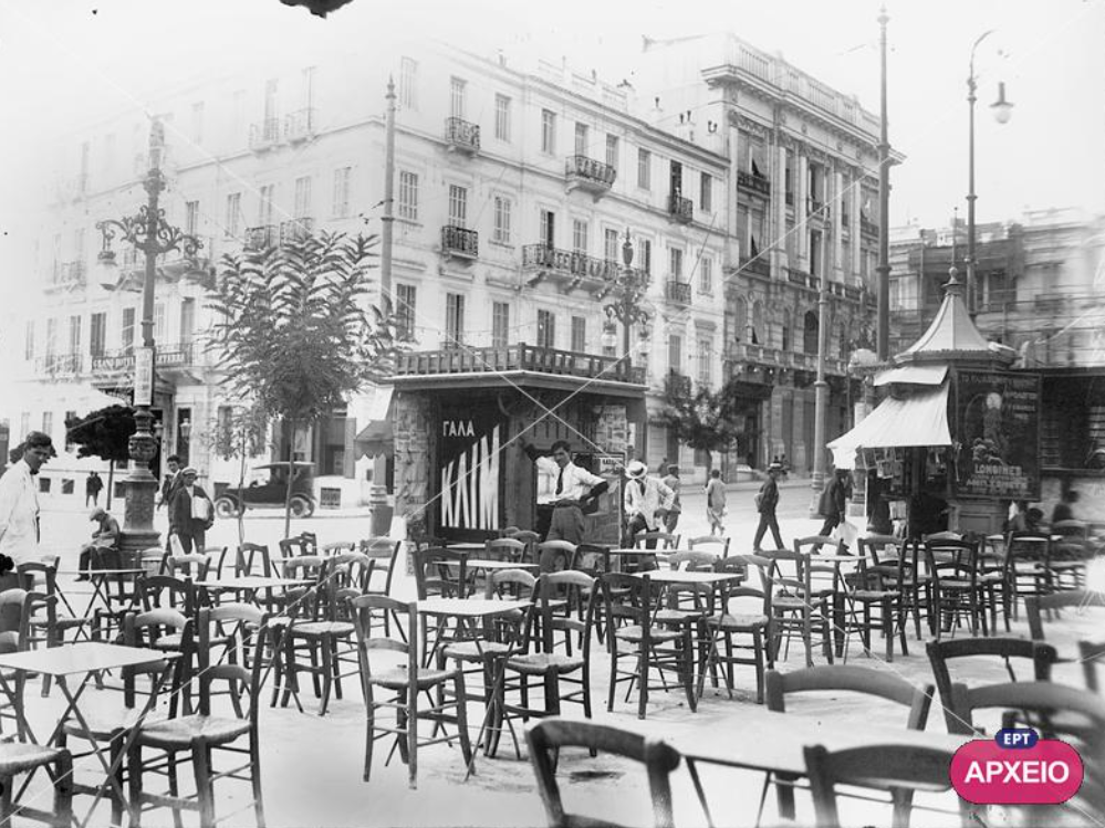 Στη φωτογραφία φαίνεται η πλατεία Συντάγματος προς την πλευρά της οδού Εμού και του ξενοδοχείου GRAND HOTEL D ANGLETERRE. Σε πρώτο πλάνο τα τραπζάκια του καφενείου Ζαροβίτη που στεγαζόταν στο ισόγειο της οικίας Κορομηλά και τα περίπτερα της πλατείας.