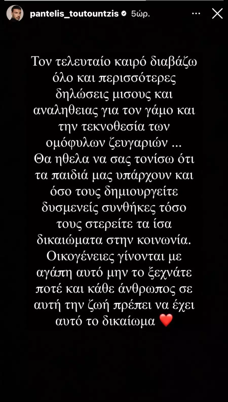 Ο Παντελής Τουτουντζής, με αφορμή το νομοσχέδιο για την τεκνοθεσία έγραψε στον προσωπικό του λογαριασμό στο Instagram:
