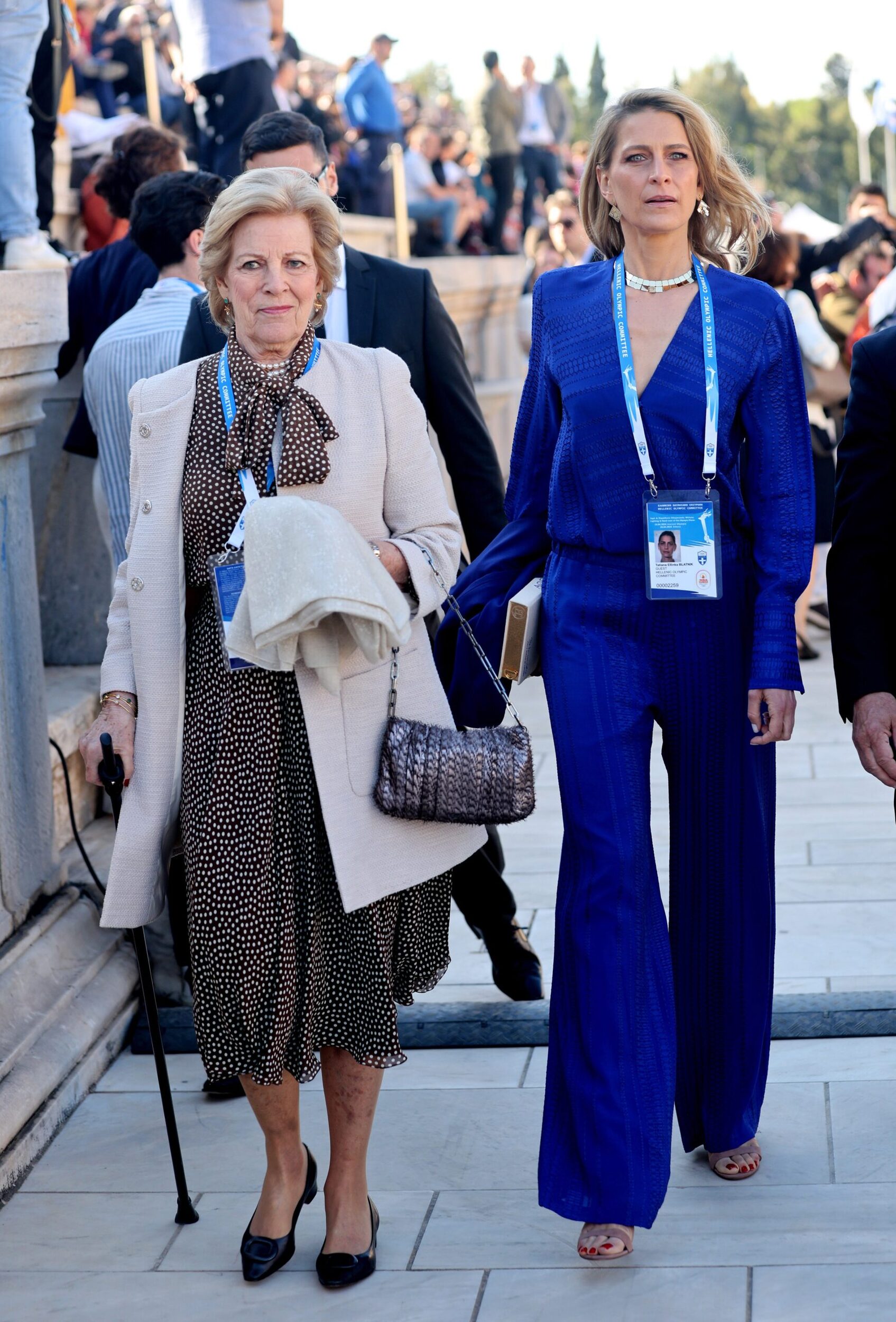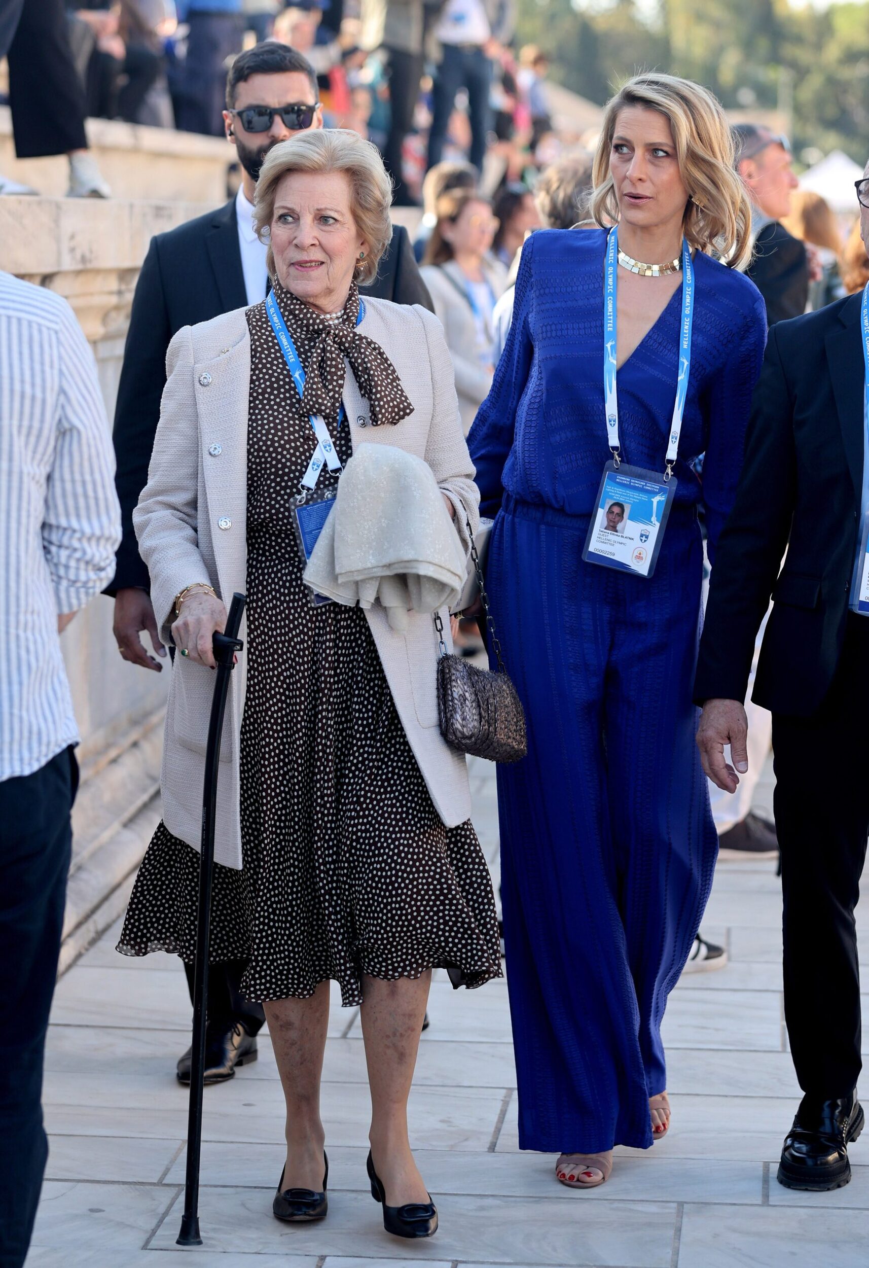 Το επιλέγμένο της σύνολο συνδυάστηκε με μπεζ σανδάλια και εντυπωσιακά σκουλαρίκια και περιδέραιο που ταιριάζουν αρμονικά, ενώ ολοκληρώθηκε με μια ξεχωριστή τσάντα από τον οίκο Olympia Le-Tan Paris, η οποία εκτιμάται στα 1,450 ευρώ. Καθώς περίμεναν την άφιξη της Ολυμπιακής Φλόγας, οι δύο γυναίκες κατέλαβαν θέση στα διαζώματα.