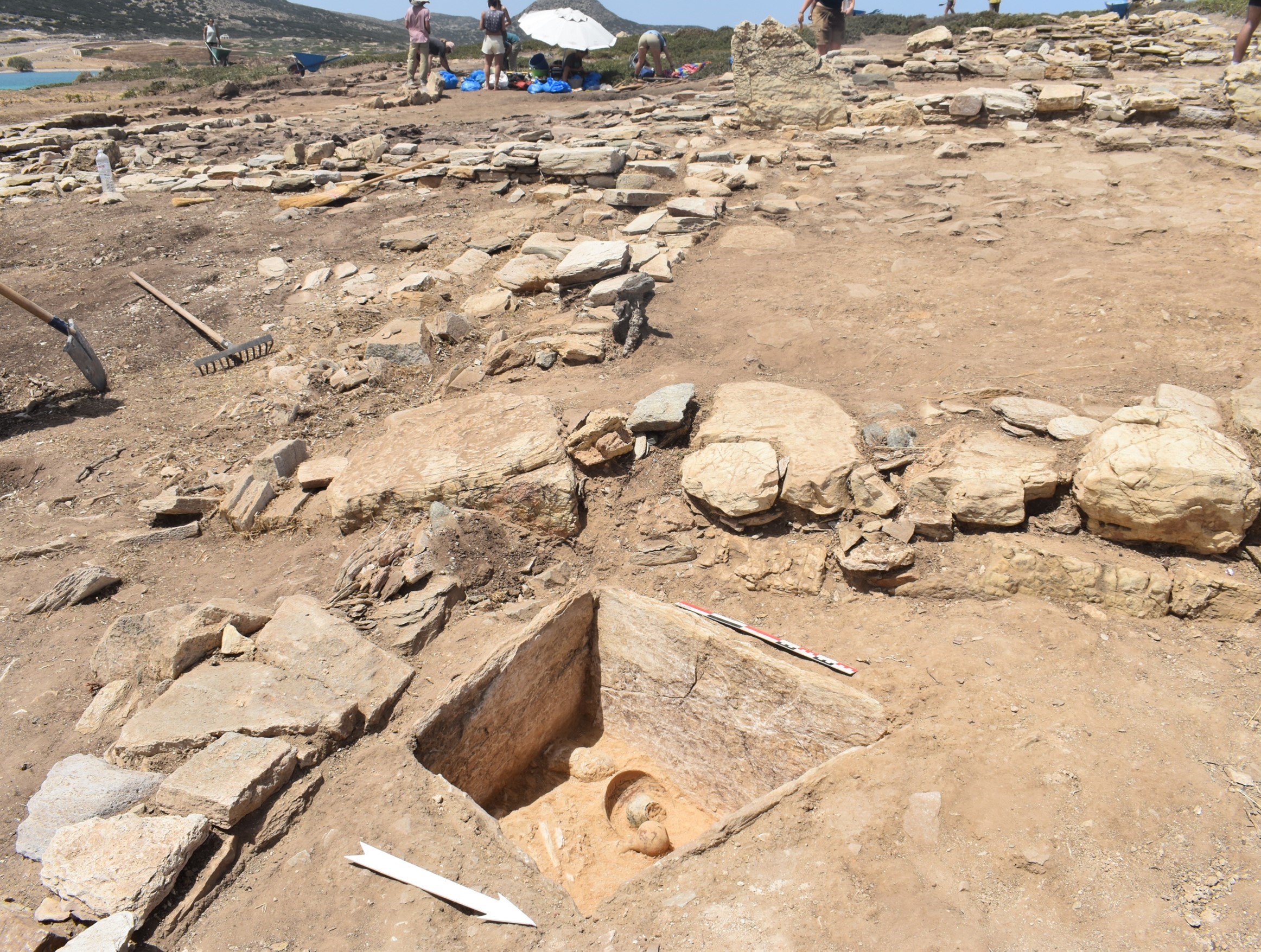 Πρωτοκυκλαδική ταφή: Η φετινή ανασκαφική περίοδος μας επεφύλασσε μια μεγάλη έκπληξη κατά τη διερεύνηση του Συγκροτήματος ΒΤ, καθώς κατά τη διερεύνηση του εσωτερικού του Χώρου 5 στο ΒΔ άκρο του Συγκροτήματος, εντοπίστηκε τραπεζοειδής, κιβωτιόσχημη κατασκευή από κάθετα τοποθετημένες λίθινες πλάκες.