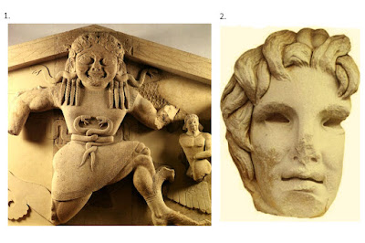 Εικόνα 8: 1. Η Μέδουσα Γοργώ του δυτικού αετώματος του αρχαϊκού ναού της Κέρκυρας (585 π.κ.ε.). Αποτροπαϊκό σύμβολο, αφού η ασχήμια του μπορεί να τρομάξει και να διώξει όποιον το αντικρίζει (Αρχαιολογικό Μουσείο Κέρκυρας) 2. Μέδουσα από την Βέροια την εποχή των Μακεδόνων βασιλέων.