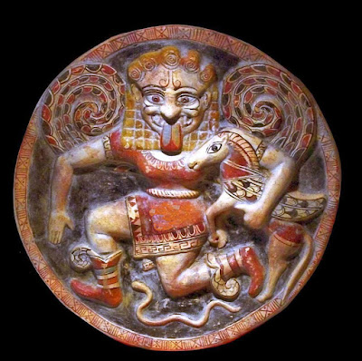 [Εικόνα 1: επάνω. Πομπή λεοντοκέφαλων δαιμόνων με σπονδικές πρόχους τις αφιερώνουν στην καθιστή θεά που υψώνει τελετουργικό σκεύος. Στον ουρανό ο τροχός του ήλιου και η ημισέληνος. Χρυσό σφραγιστικό δαχτυλίδι, το μεγαλύτερο σωζόμενο από τον Μυκηναϊκό κόσμο. Από τον «Θησαυρό της Τίρυνθας» 15ος αι. π.κ.ε. Αθήνα, Εθνικό Αρχαιολογικό Μουσείο, Προϊστορική Συλλογή. Η τελετουργία σχετίζεται με την ευφορία της γης και την αναγέννηση της φύσης. Οι πλέον φημισμένες μάγισσες φαρμακίδες στην Ελλάδα ήταν Θεσσαλές, οι οποίες θεωρούνταν ότι είχαν τη δυνατότητα να κατεβάζουν τη Σελήνη από τον ουρανό και να τη φυλακίζουν ή να προκαλούν έκλειψη Ηλίου!]