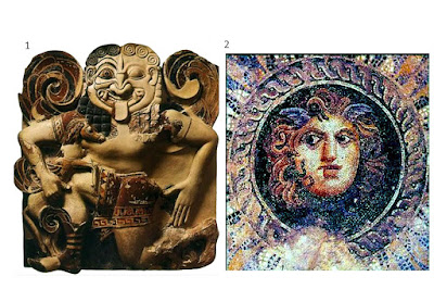 Εικόνα 4: 1. Μέδουσα από Ελληνικό ναό στις Συρακούσες 575 π.κ.ε.-Μεγάλη Ελλάδα. 2. Μέδουσα στο Δίον των Ελλήνων ψηφιδωτό σε δάπεδο την εποχή των μακεδόνων βασιλέων.