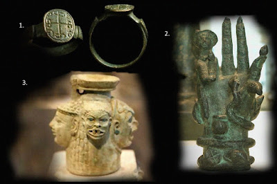 Εικόνα 17: 1. Ο χριστιανικός σταυρός ως αποτροπαϊκό σύμβολο. Σταυροί τοποθετούνταν σε τοίχους, πόρτες, παράθυρα ιδιωτικών και δημόσιων κτιρίων προκειμένου να τα καταστήσουν απρόσβλητα από τους δαίμονες. 2. Αντικείμενο ρωμαϊκής εποχής με αποτροπαϊκά σύμβολα 3. Ελληνικό σκεύος από την αρχαϊκή εποχή με πολλαπλές μορφές δράκων δαιμόνων και άλλων.