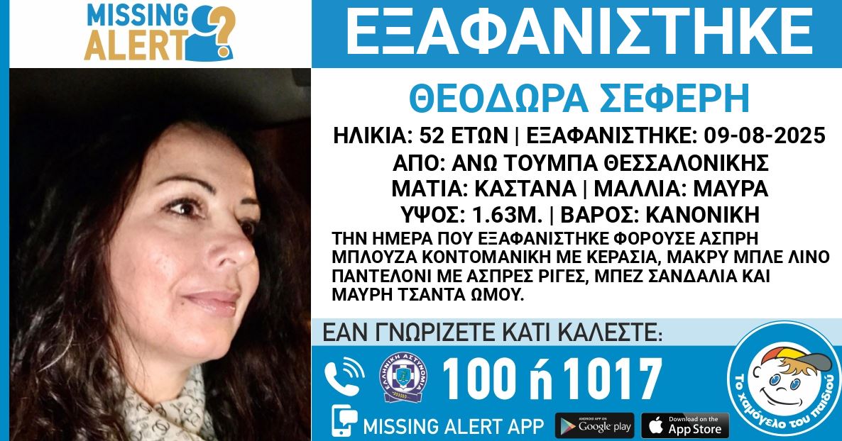 «Στις 09/08/2025, πρωινές ώρες, εξαφανίστηκε από την περιοχή της Άνω Τούμπας στην Θεσσαλονίκη, η Θεοδώρα Σεφέρη, 52 ετών. «Το Χαμόγελο του Παιδιού» ενημερώθηκε σήμερα, 10/08/2025, για την εξαφάνιση της Θεοδώρας Σεφέρη και προχώρησε στη δημοσιοποίηση των στοιχείων της ενήλικης κατόπιν αιτήματος της οικογένειας της, καθώς ενδέχεται να συντρέχουν λόγοι οι οποίοι θέτουν τη ζωή της σε κίνδυνο».