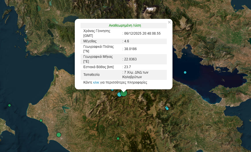 Σύμφωνα με το Γεωδυναμικό Ινστιτούτο, το επίκεντρο του σεισμού εντοπίζεται 7 χιλιόμετρα νότια-νοτιοδυτικά των Καλαβρύτων, ενώ το εστιακό βάθος υπολογίζεται σε 23,7 χιλιόμετρα.
