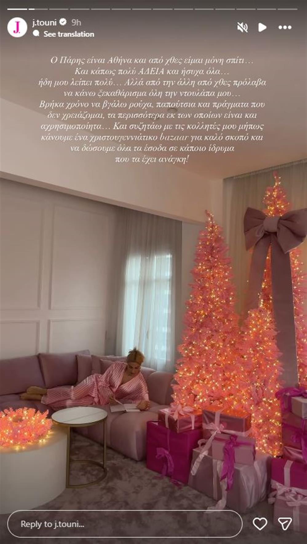«Ο Πάρης είναι Αθήνα και από χθες είμαι μόνη σπίτι… Και κάπως πολύ ΑΔΕΙΑ και ήσυχα όλα… ήδη μου λείπει πολύ… Αλλά από την άλλη από χθες πρόλαβα να κάνω ξεκαθάρισμα όλη την ντουλάπα μου… Βρήκα χρόνο να βγάλω ρούχα, παπούτσια και πράγματα που δεν χρειάζομαι, τα περισσότερα εκ των οποίων είναι και αχρησιμοποίητα… Και συζητάω με τις κολλητές μου μήπως κάνουμε ένα χριστουγεννιάτικο bazaar για καλό σκοπό και να δώσουμε όλα τα έσοδα σε κάποιο ίδρυμα που τα έχει ανάγκη!» έγραψε η Ιωάννα Τούνη.