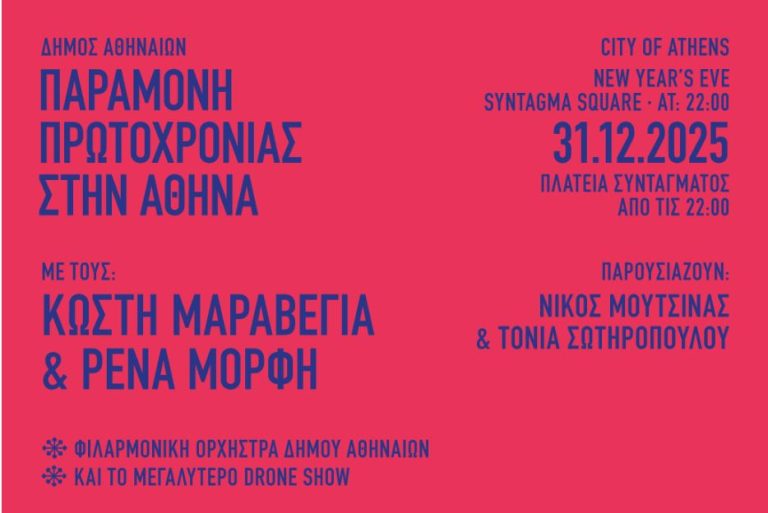 Πρωτοχρονιάς, ο Δήμος Αθηναίων θα υποδεχθεί το νέο έτος με μια λαμπερή γιορτή, γεμάτη μουσική, χορό και πολλές εκπλήξεις, στην πλατεία Συντάγματος.Ο Δήμαρχος Αθηναίων, Χάρης Δούκας, δήλωσε: «Ελάτε να υποδεχτούμε μαζί το 2026 στην καρδιά της πόλης. Αλλάζουμε χρονιά στο Σύνταγμα με Κωστή Μαραβέγια, Ρένα Μόρφη, Νίκο Μουτσινά και Τόνια Σωτηροπούλου. Όπως και πέρυσι, θα έχουμε αθόρυβα πυροτεχνήματα, σεβόμενοι το περιβάλλον, τους ευαίσθητους στον ήχο συνανθρώπους μας και τα ζώα. Σας καλώ να ζήσουμε μοναδικές στιγμές με αγαπημένους καλλιτέχνες, να απολαύσουμε ένα εντυπωσιακό drone show και να καλωσορίσουμε το νέο έτος με αισιοδοξία και χαμόγελα».