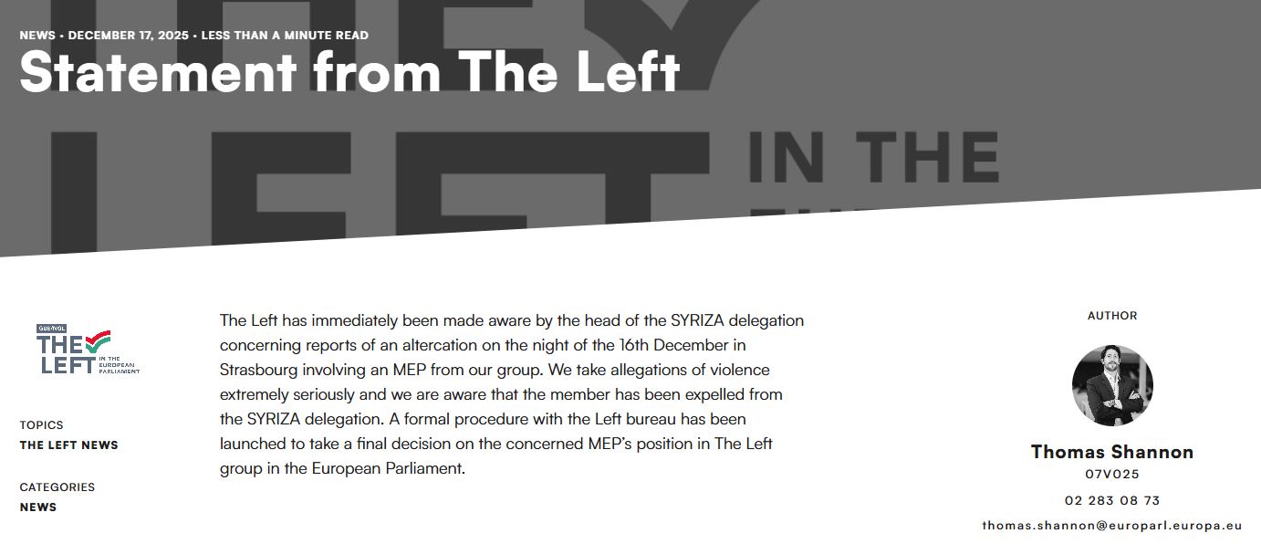 «Λαμβάνουμε πολύ σοβαρά υπόψη τις καταγγελίες για βία και γνωρίζουμε ότι το μέλος αυτό έχει διαγραφεί από την ευρωομάδα του ΣΥΡΙΖΑ. Έχει κινηθεί επίσημη διαδικασία στο γραφείο της Αριστεράς για τη λήψη τελικής απόφασης σχετικά με τη θέση του εν λόγω ευρωβουλευτή στην ομάδα της Αριστεράς στο Ευρωπαϊκό Κοινοβούλιο» αναφέρει η ανακοίνωση της ευρωομάδας.
