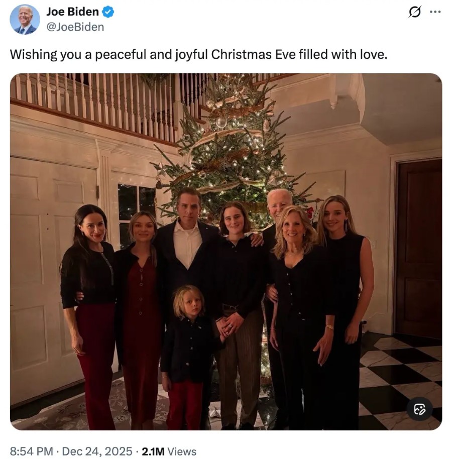 των ΗΠΑ, Τζο Μπάιντεν προκειμένου να ευχηθεί για τα Χριστούγεννα.«Σας εύχομαι μια ειρηνική και χαρούμενη παραμονή Χριστουγέννων γεμάτη αγάπη» έγραψε στην ανάρτηση ο πρώην πρόεδρος. Ωστόσο στο κέντρο της φωτογραφίας είναι ο γιος του Χάντερ Μπάινεν και οι εγγονές του.