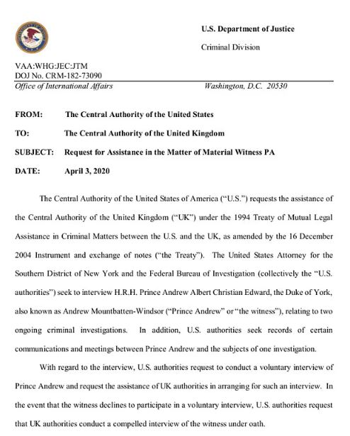 Το έγγραφο, με ημερομηνία 3 Απριλίου 2020, ζητούσε τη διευκόλυνση συνέντευξης του τότε δούκα της Υόρκης από πράκτορες του FBI και ανέφερε ότι υπάρχει «απόδειξη ότι ο πρίγκιπας Άντριου ενεπλάκη σε σεξουαλική συμπεριφορά που αφορά ένα από τα θύματα του Έπσταϊν».