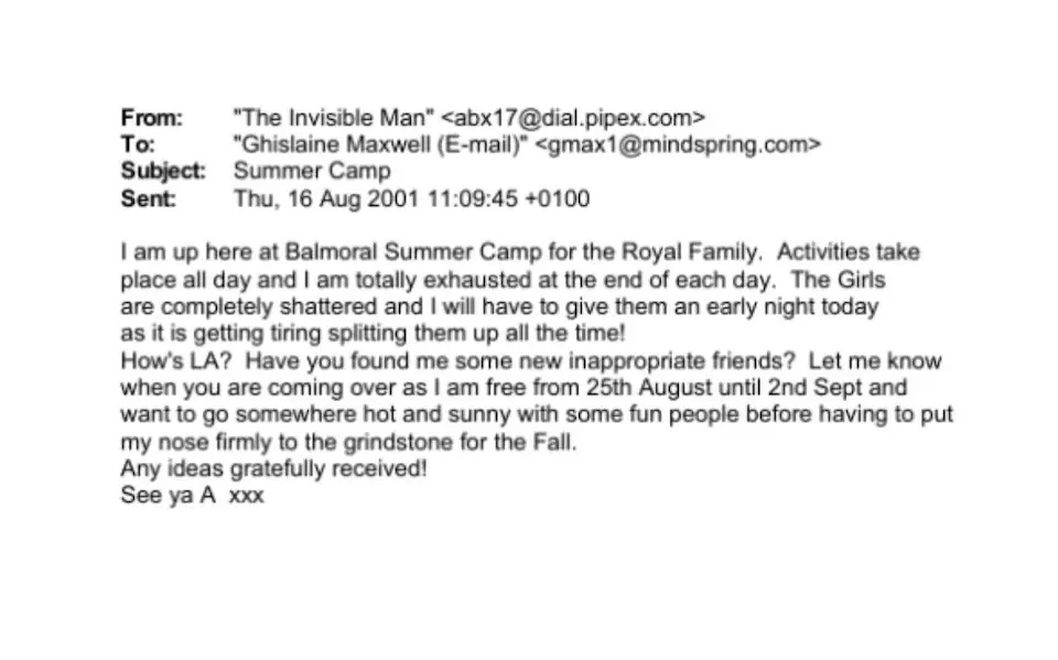 Τον Αύγουστο του 2001, ο άνδρας που υπογράφει ως «A xxx» γράφει στη Μάξγουελ: «Είμαι εδώ πάνω στο Balmoral Summer Camp για τη βασιλική οικογένεια».