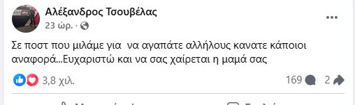 Λίγες ώρες μετά, κι αφού κατέβηκε το post, ο Αλέξανδρος Τσουβέλας επανήλθε με νέα ανάρτηση, απαντώντας σε όσους προσβλήθηκαν,. «Σε ποστ που μιλάμε για να αγαπάτε αλλήλους κάνατε κάποιοι αναφορά… Ευχαριστώ και να σας χαίρεται η μαμά σας» έγραψε εμφανώς ενοχλημένος.