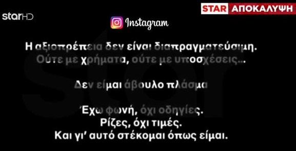Πριν από λίγες ώρες, ο 21χρονος προχώρησε σε ένα ιδιαίτερα αιχμηρό story στο Instagram, το οποίο αφήνει σαφείς υπαινιγμούς. Υπονοεί ότι κάποιος ή κάποιοι επιχείρησαν να τον φιμώσουν, προσφέροντάς του χρήματα και υποσχέσεις. «Η αξιοπρέπεια ΔΕΝ είναι διαπραγματεύσιμη. Ούτε με χρήματα, ούτε με υποσχέσεις. Δεν είμαι άβουλο πλάσμα. Έχω φωνή, ΟΧΙ οδηγίες. Ρίζες, ΟΧΙ τιμές. Και γι’ αυτό στέκομαι όπως είμαι», αναφέρει χαρακτηριστικά στην επίμαχη ανάρτηση.