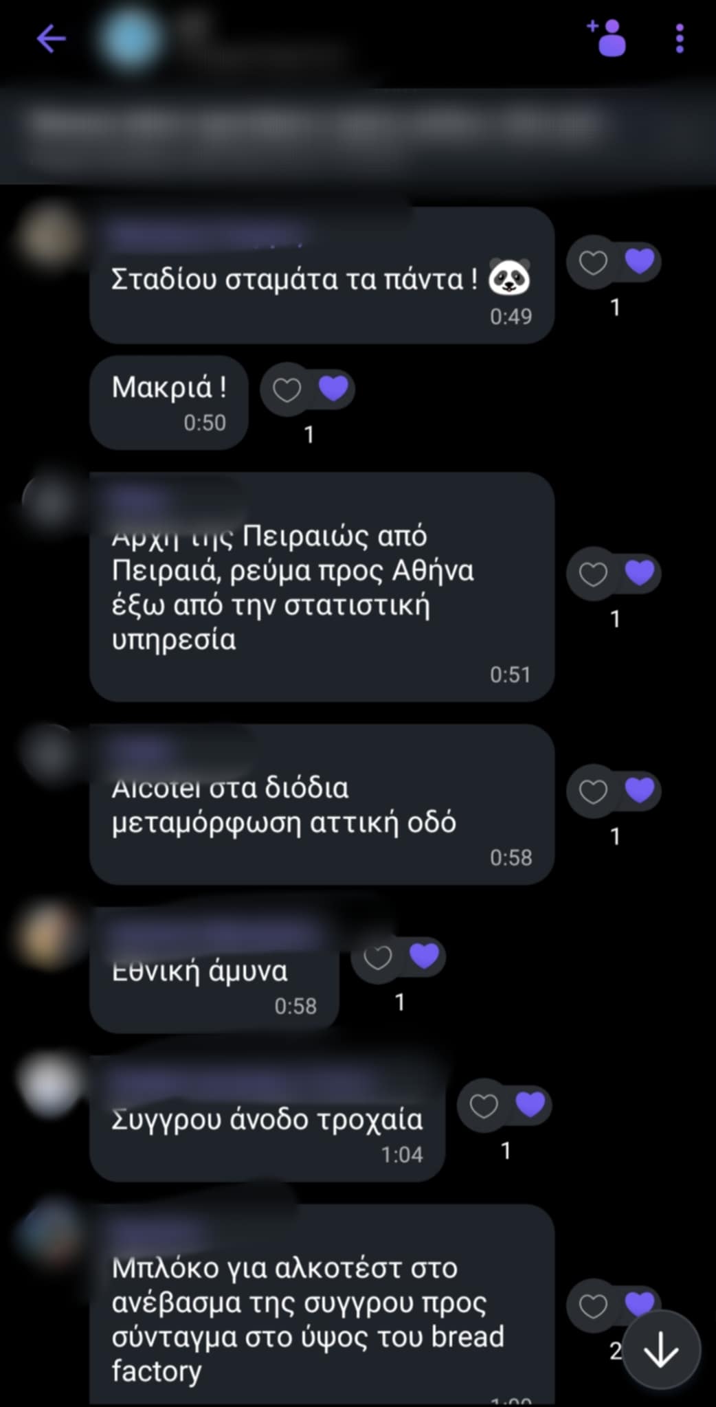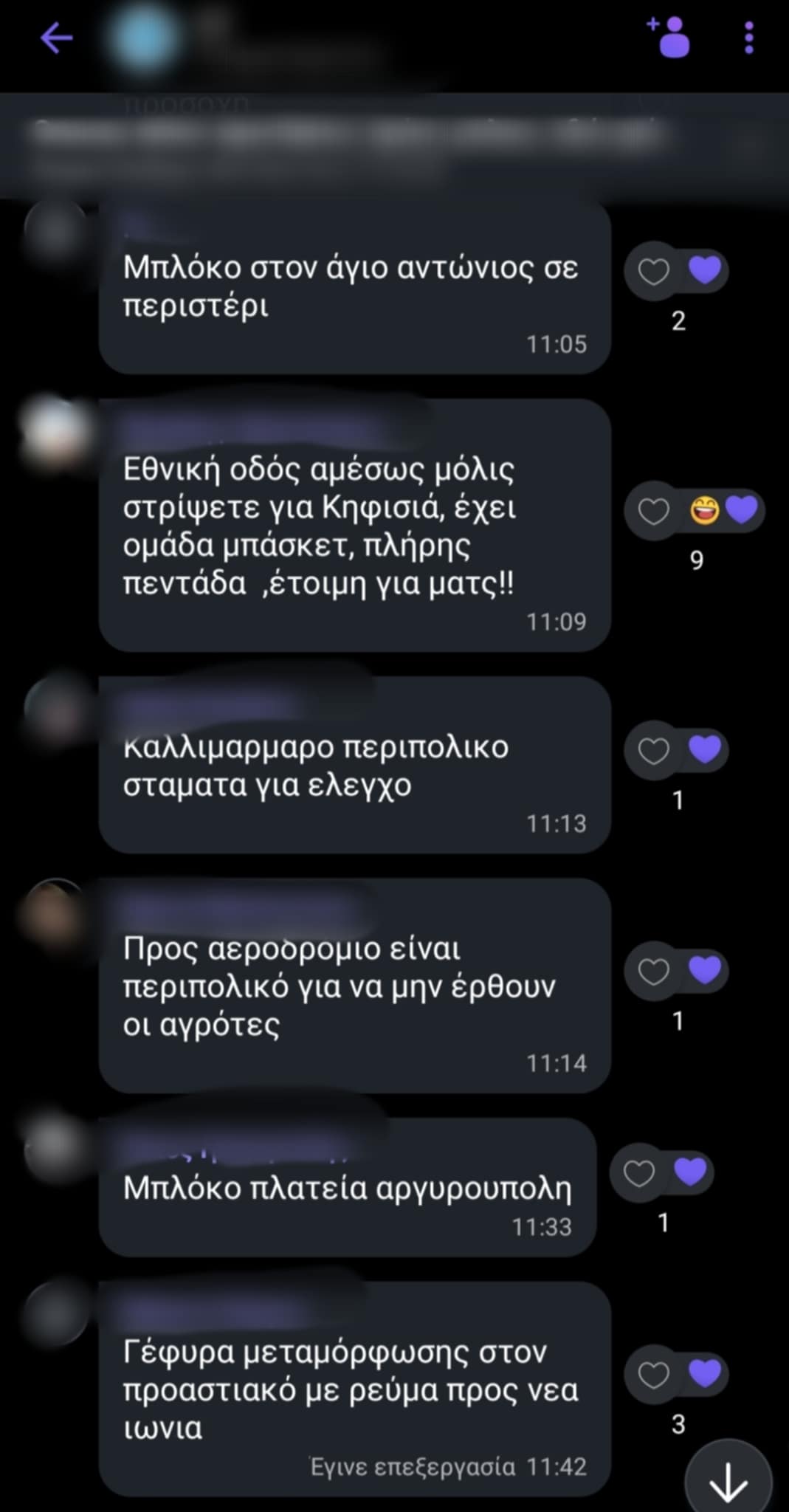 «Εθνική Οδός αμέσως μόλις στρίψετε για Κηφισιά, έχει ομάδα μπάσκετ, πλήρης πεντάδα, έτοιμη για ματς!» προειδοποιεί ένας οδηγός για μπλόκο της Τροχαίας σε γκρουπ που αριθμεί πάνω από 20.000 άτομα, μόλις πριν από λίγες ώρες, το πρωί της Τρίτης (23/12), και ακολουθούν μέσα σε ελάχιστα λεπτά αντίστοιχα μηνύματα για τους γύρω δρόμους. «Σταδίου σταματάνε τα πάντα! Μακριά!» γράφει ένας άλλος στις 00:49 το βράδυ του Σαββάτου, με άλλους χρήστες να προσθέτουν και χάρτες με τα ακριβή σημεία, ενώ την ίδια στιγμή ορισμένοι στέλνουν ηχητικά και φωτογραφίες.